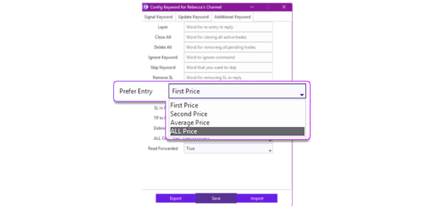No more picking just one entry price from the entry range! Now your trades can trigger with both entry prices β maximizing opportunities For example: A signal like XAUUSD BUY 3000-3010 and if you select ALL PRICE option, It will open trades with 3000 and 3010 entry price.