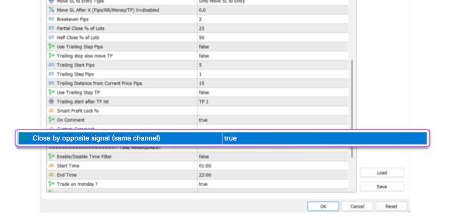 If a new opposite signal (e.g., Sell) arrives for the same pair from the same channel, your current trade (e.g., Buy) will auto-close.