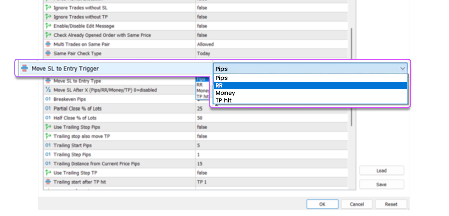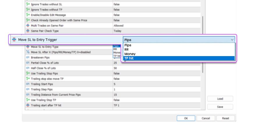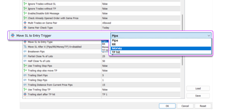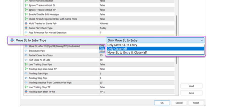 Select from "Move SL to Entry" or "Move SL & Close Half" to control risk. Adjust settings to auto-move SL and close half after reaching desired pips.