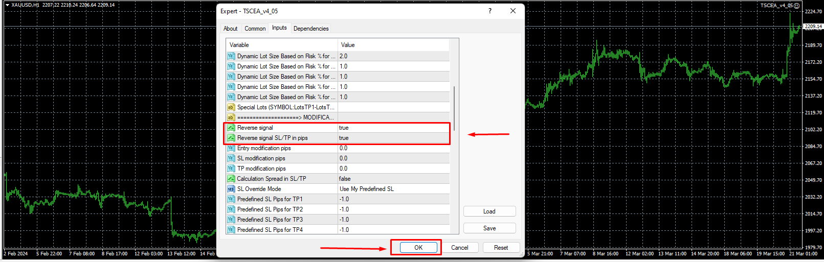 Now, the second option- Reverse Signal SL/TP in Pips. Turn the Reverse Signal SL/TP in Pips to true and click OK. (See the image below)