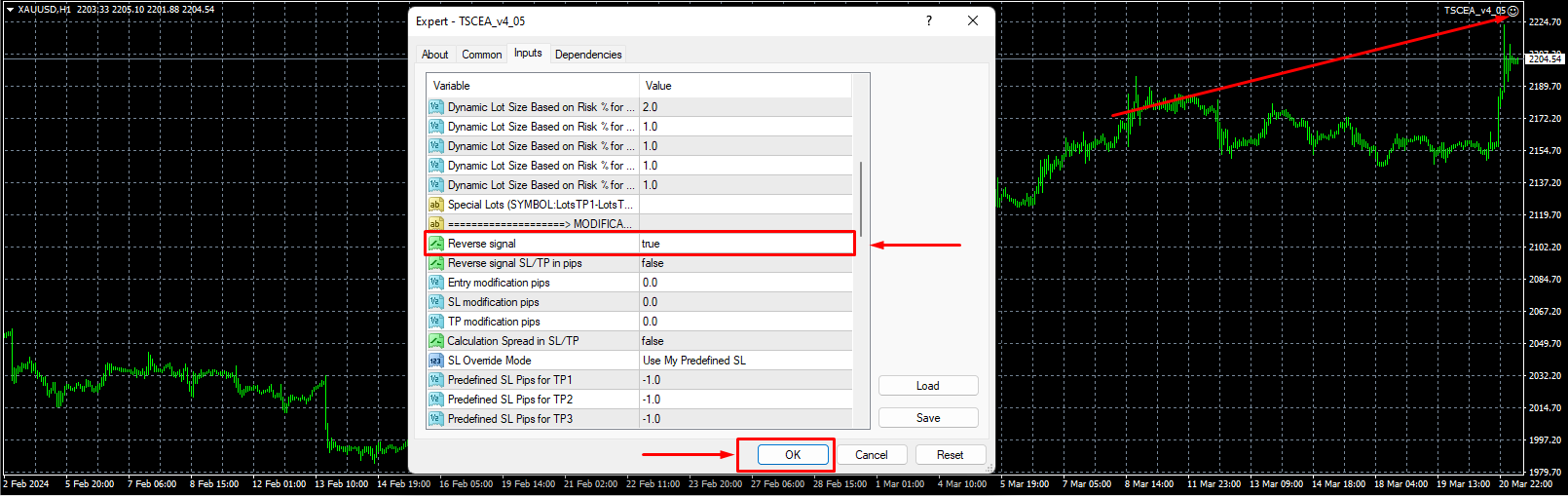 Now, the second option- Reverse Signal SL/TP in Pips. Turn the Reverse Signal SL/TP in Pips to true and click OK. (See the image below)