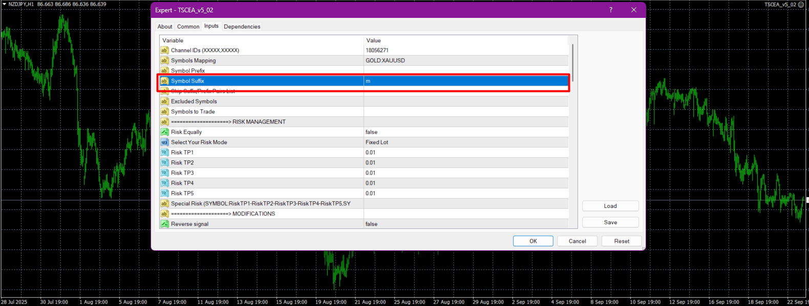 Suppose your broker uses suffix- m like the above image. Just input the m in the suffix section of the EA, shown below.