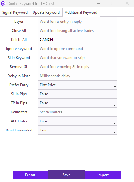 Some telegram signal providers command to remove a pending order. To follow the command, exact keywords (from the reply message) need to be entered in the Delete field.