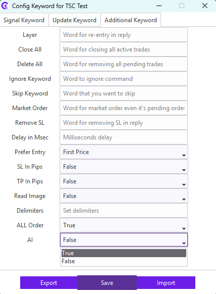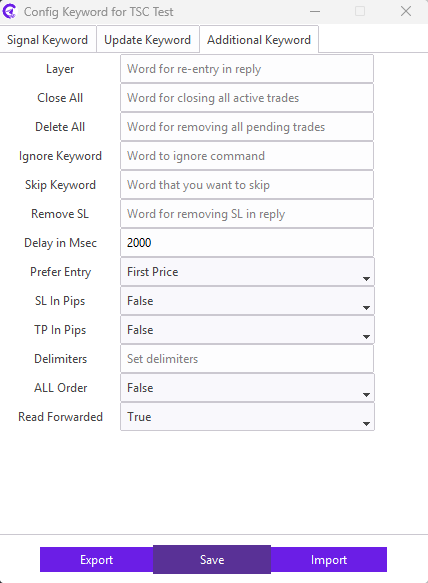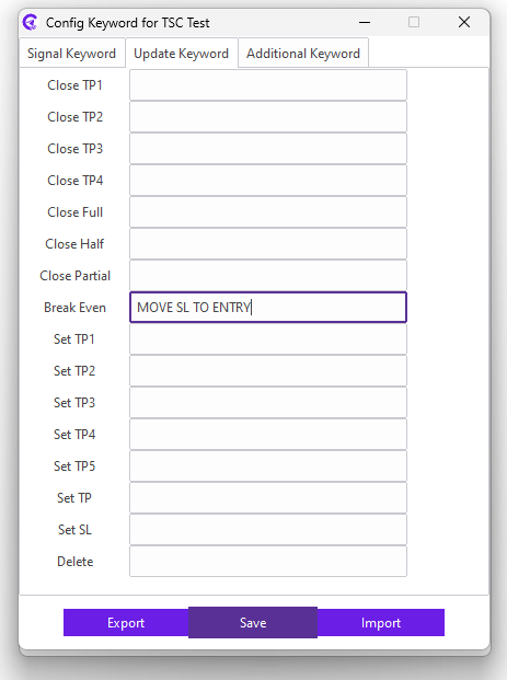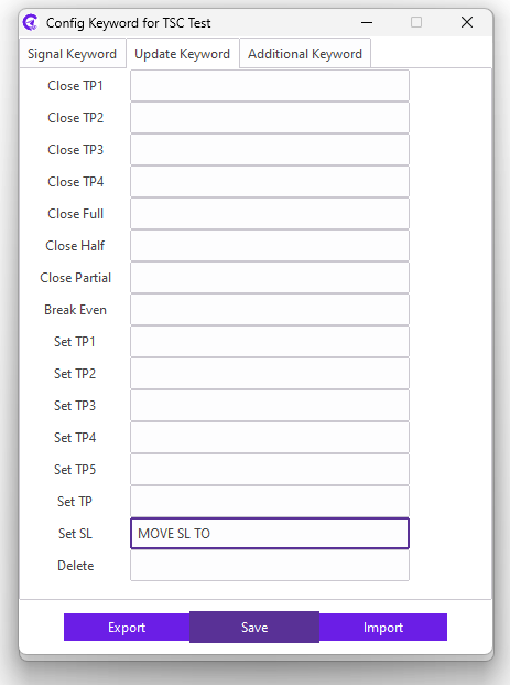 For example: Our signal provider uses STOP LOSS keyword in the signal for the SL; we need to enter STOP LOSS keyword in the SL field. Similarly, TAKE PROFIT1, TAKE PROFIT2, TAKE PROFIT3 keyword in the signal for the TP; we need to enter TAKE PROFIT1,TAKE PROFIT2,TAKE PROFIT3 keyword in the TP field.