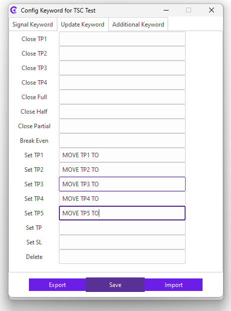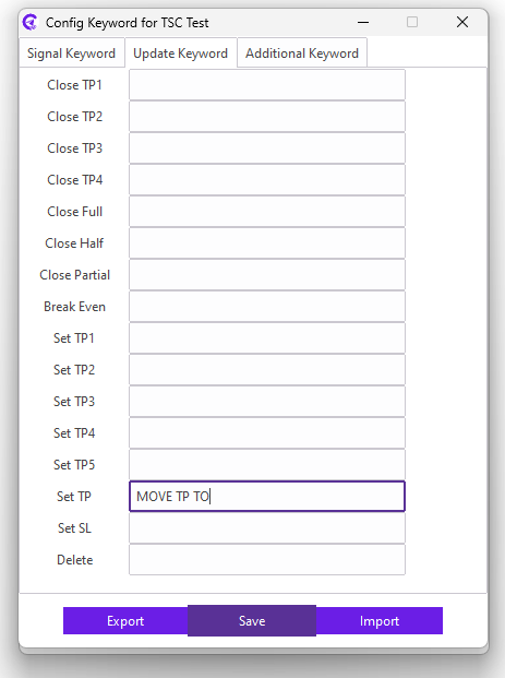 For example: Our signal provider uses the MOVE TP1 TO keyword in the reply message for moving TP1; we need to enter the MOVE TP1 TO keyword in the Set TP1 field.