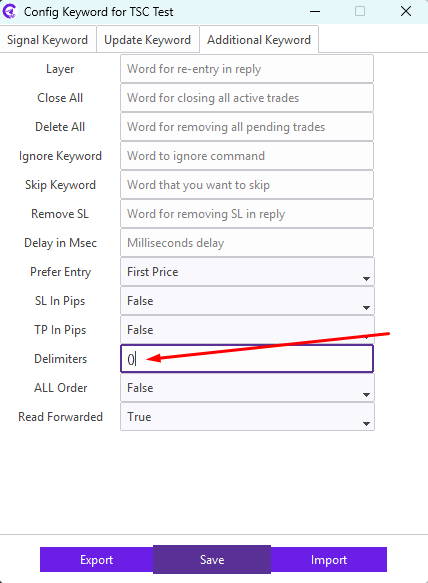 Some telegram signal providers command to remove a pending order. To follow the command, exact keywords (from the reply message) need to be entered in the Delete field.