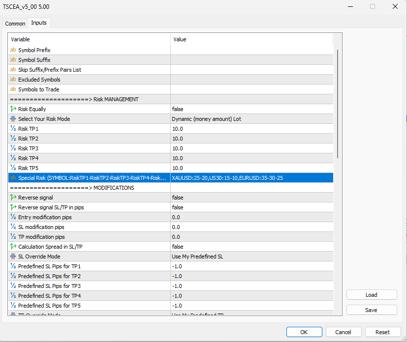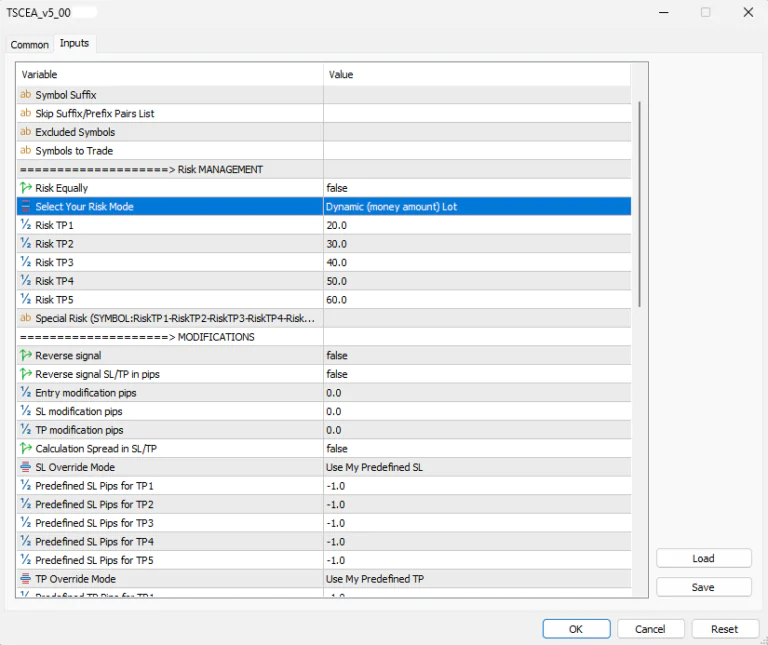 Just open your TSC EA settings and scroll down to Select Your Risk Mode; after that, select Dynamic (money amount) Lot for Risk TP1, Risk TP2, Risk TP3, Risk TP4, and Risk TP5 options to set your money amount.